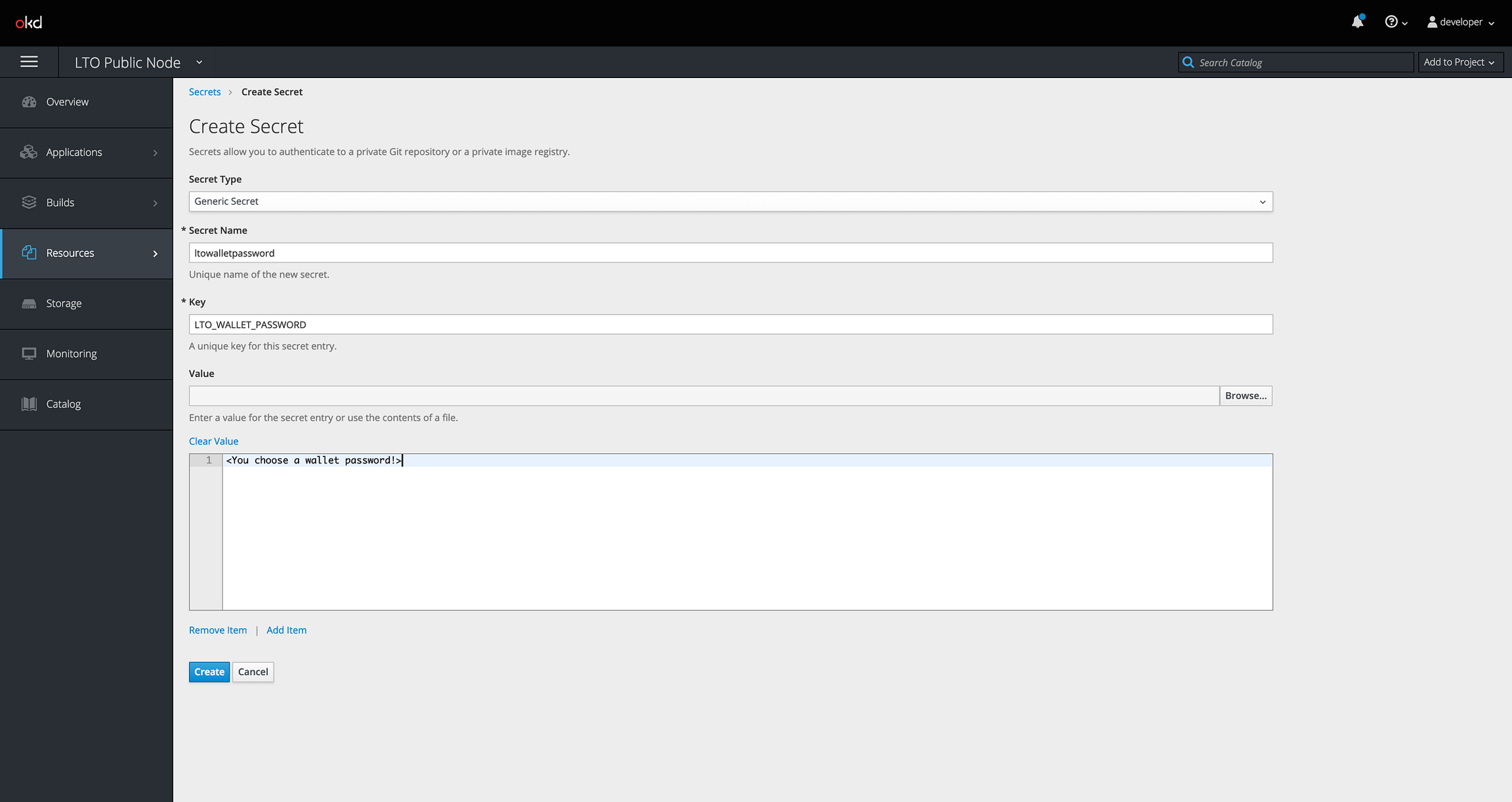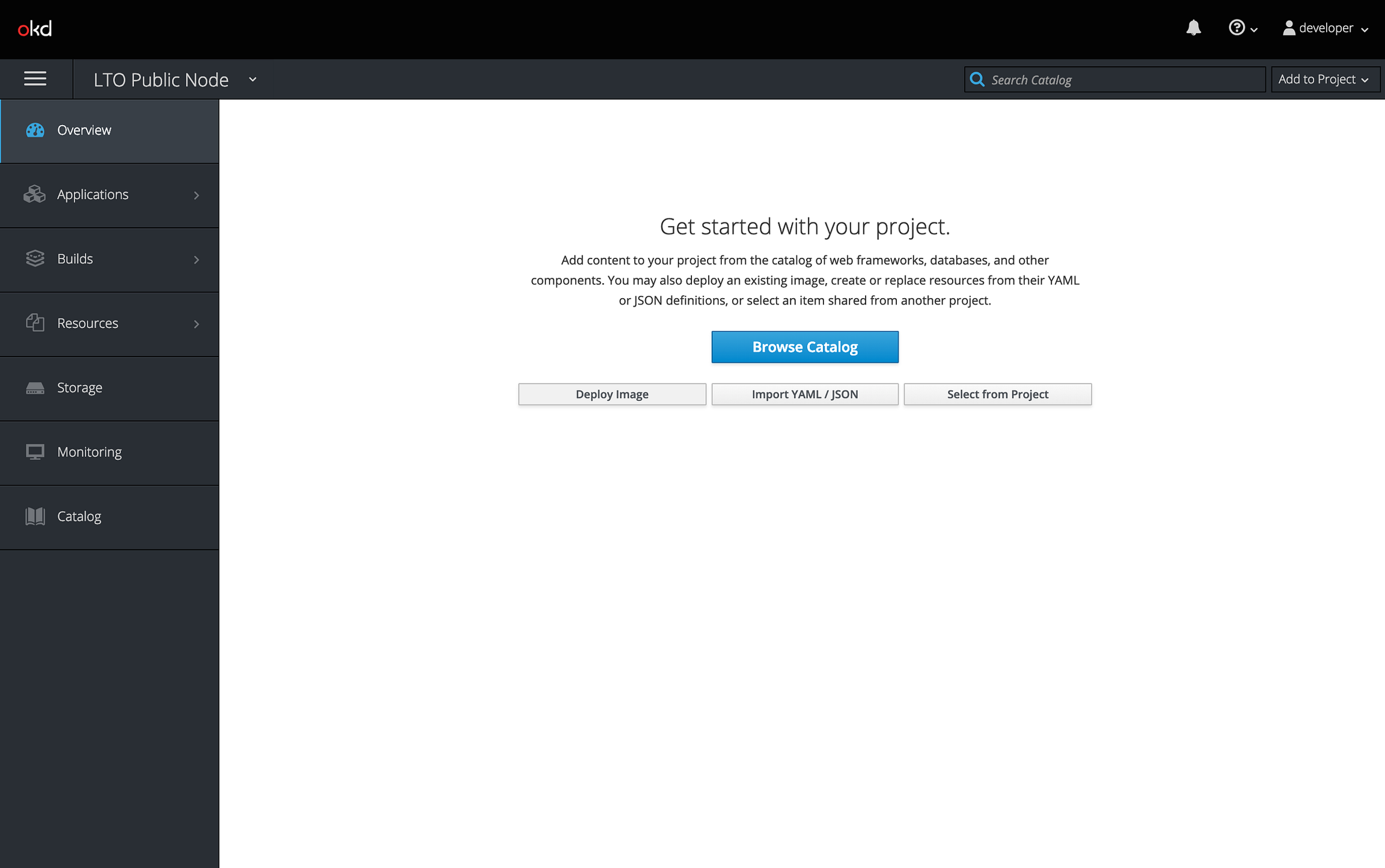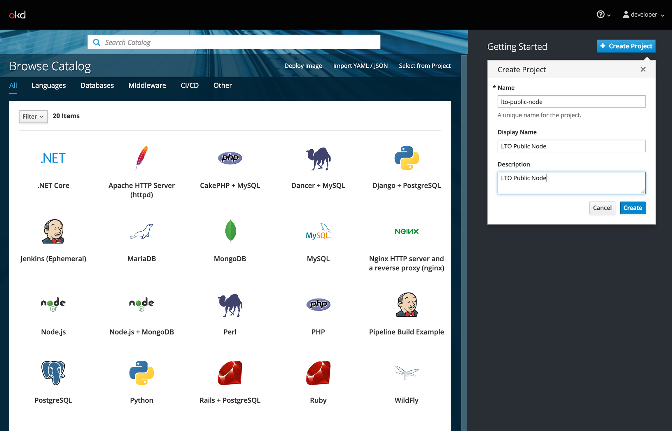 Before deploying our node on our OKD environment we create a project (Kubernetes namespace). A project is only visible to you or to users you give access to. Let's create a project called “lto-public-node”.