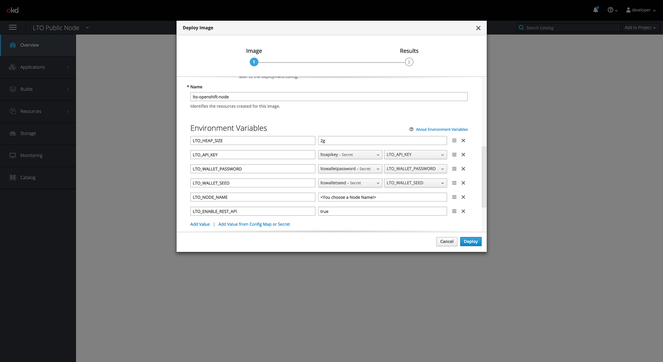 In this step you actually configure your node. We use the Add Value link to add “normal” environment variables. We use Add Value from Config Map or Secret to configure environment variables from the secrets we created earlier.
