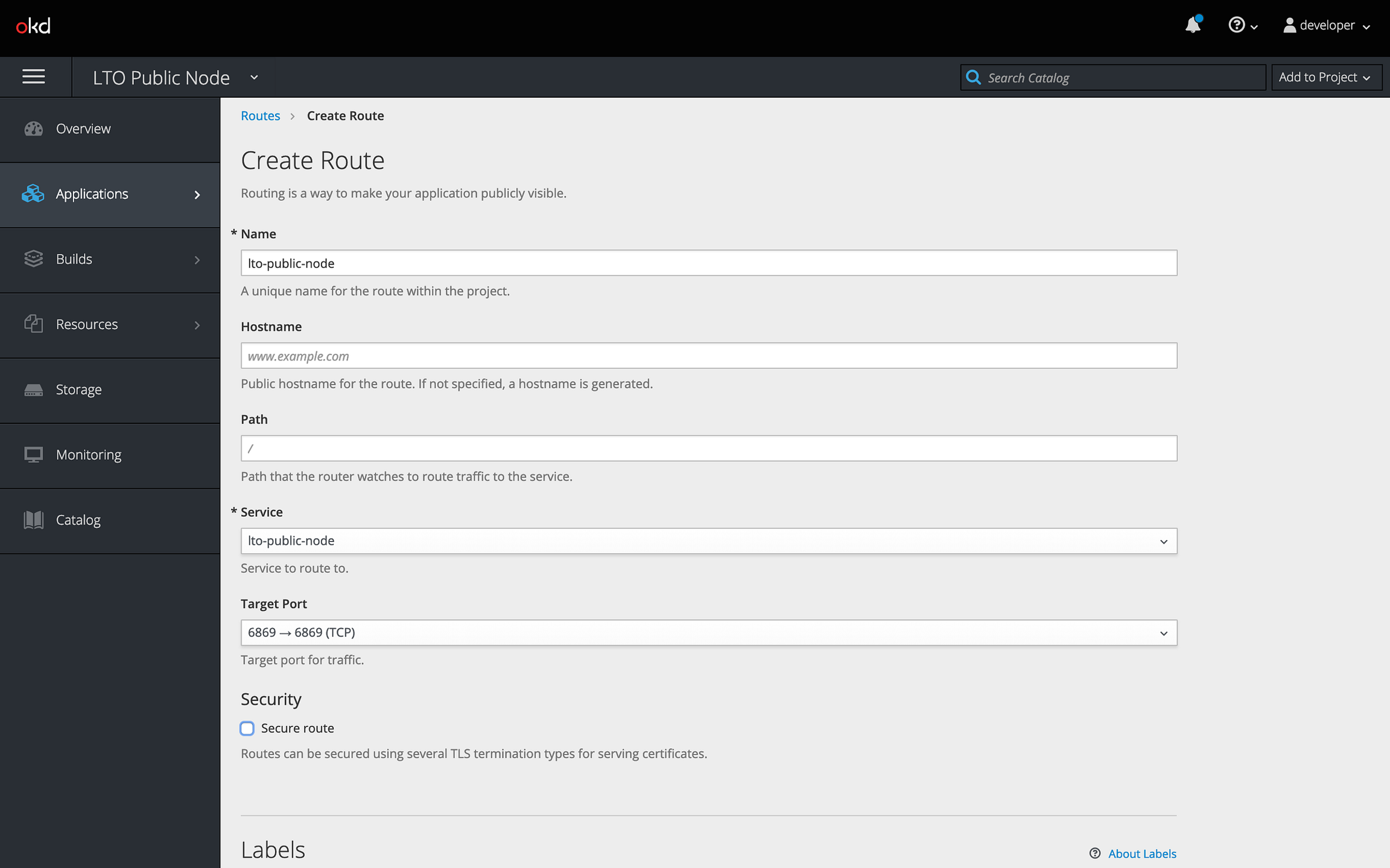 Not a lot you need to change here. You can of course choose to make it a secure route. The LTO node exposes the API over HTTP. With this, you can make it HTTPS. Make sure to select 6869 → 6869 (TCP) as your Target Port. Scroll down and click the route creation button to create the route and expose your Swagger UI.
